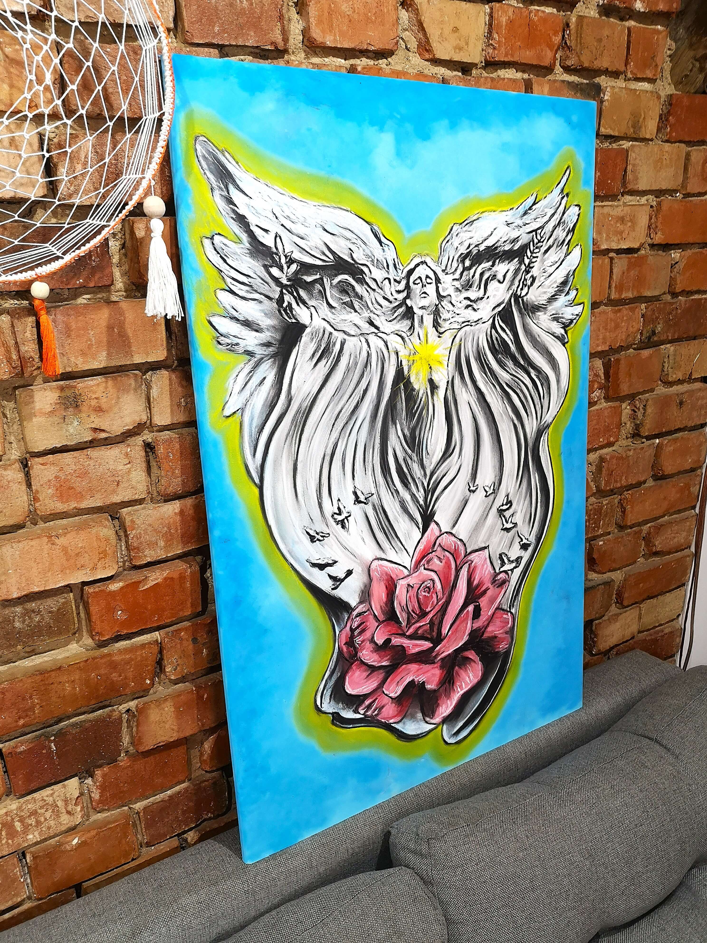 Anioła malowałem w prezencie dla mojej mentorki programu "Akademia Bogatej Duszy" (półroczny kurs mentoringowy, w którym zdobyłem certyfikat coacha). Obraz to forma wyrażenia wdzięczności. Wręczyłem go osobiście na gali kończącej Akademię.